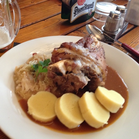 With my hand removed from my pants and clutching my purchase, we headed towards a main thoroughfare in search of a spot of lunch. We found a little cafe with outdoor seating under an arched gallery — a lucky find as it now began to drizzle — with local specialities and Czech beer on tap just below castle hill. The meal was delicious.